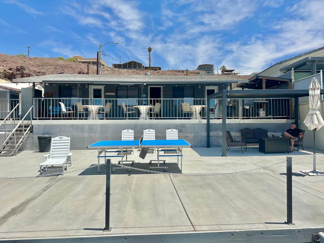 Massive Riverfront Area with Covered Fire Table Seating Area and Pergola